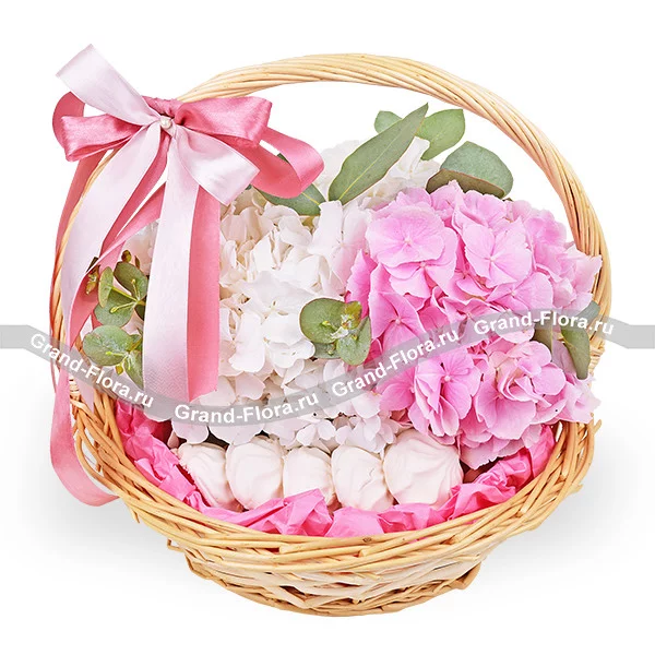 Стандартный: гортензия белая - 2 шт., гортензия розовая - 1 шт., эвкалипт, зефир, оазис, декор, корзина.