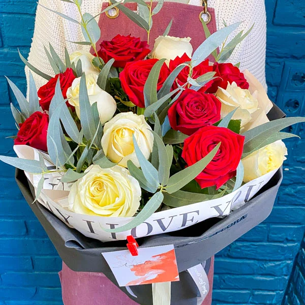 Букет из красных и белых роз, гармонично дополненный эвкалиптом, станет отличным поздравлением как для женщин, так и для мужчин.